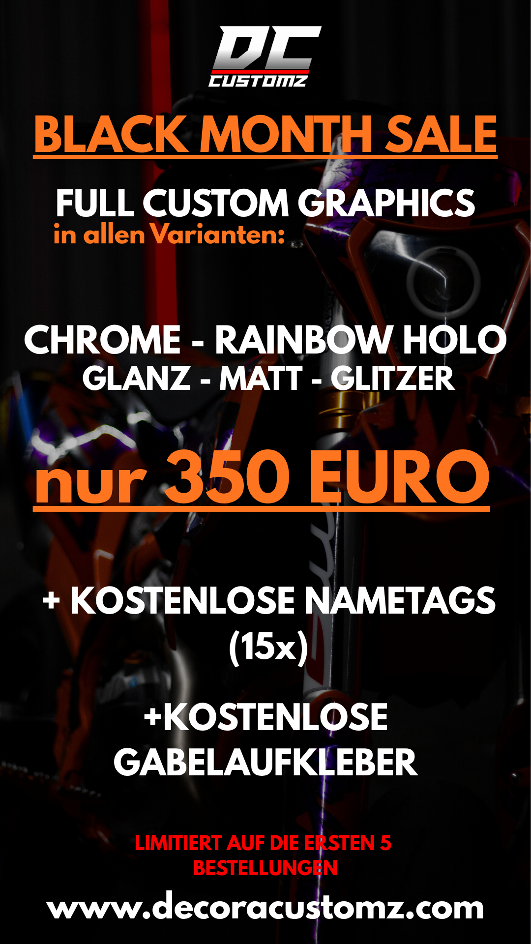 Ein Full-Custom-Dekor wird von Grund auf individuell für dich entworfen – exakt nach deinen Ideen, Wünschen und deinem Style. Du bestimmst das Design, die Farben, die Logos und jedes Detail selbst, und wir setzen es 1:1 für dein Bike um.